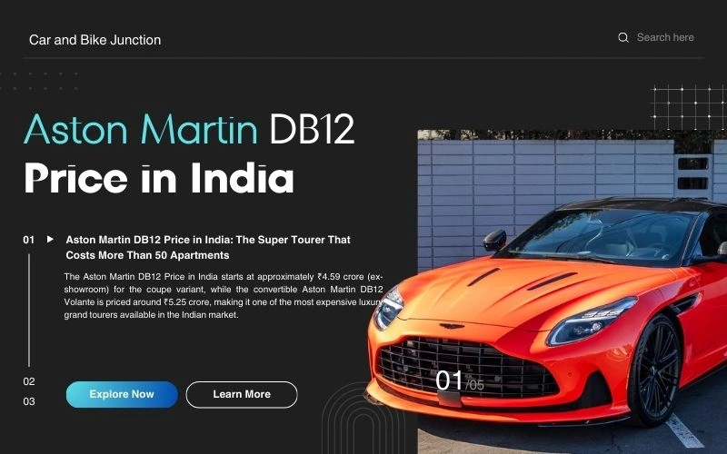 A: The Aston Martin DB12 Price in India starts at ₹4.59 crore (ex-showroom) for the coupe and ₹5.25 crore for the Volante convertible. On-road prices can reach ₹5.15-5.90 crore depending on your state and customization choices.